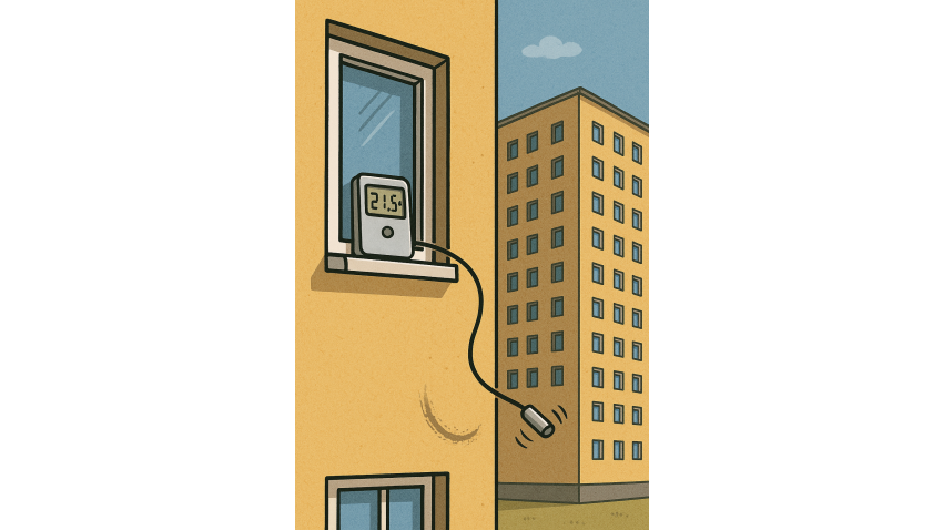 Termometergivare får inte hänga längre ut än till fönsterblecket. När de dinglar mot fasaden orsakar de skrapmärken på våra nyrenoverade väggar. Hjälp oss bevara husen...