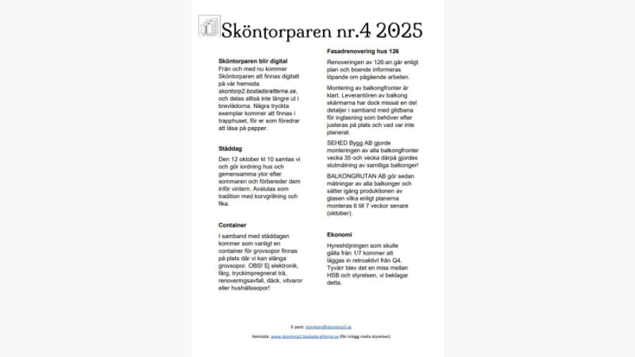 Du har väl inte missat att Sköntorparen numera inte delas ut i brevlådan, utan finns digitalt på vår hemsida? Nummer 4/2025 finns nu upplagd där. Man loggar in, och klickar på "Sköntorparen" i menyn för att se både det senaste samt tidigare nummer.
